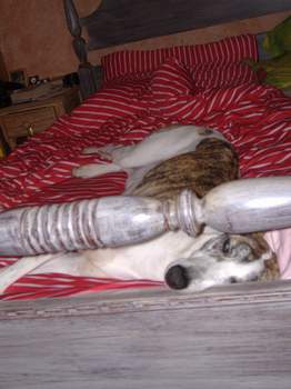 An den Ellbogen hat sie beidseitig Schleimbeutel, diese verschwinden aber von allein wieder, wenn sie auf weichen Kissen liegt. Heute, an ihrem ersten Abend bei uns, hat sie (frischgebadet) schon das Bett gefunden.