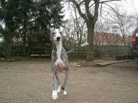 "Hast Du gut ausgesucht den Paco, auch wenn Nicolai (noch) sehr beleidigt ist, “den haben wir doch gar nicht gebraucht”. Paco ist ein ganz lieber, freundlicher Schatz, der möglichst alles richtig machen möchte und vermittelt, dass er sich freut. Heidi hat ihm natürlich gleich klar gemacht, wer hier die Seniorchefin ist und Sofie hält ihn mit Gezicke auf Abstand, die Greys sind dagegen interessiert und wedeln ihn freundlich an, nur als er ins Bett wollte, wo Dama schon war, hat Dama ein bisschen geknurrt. Das gemeinsame Futtern in der Küche ist problemlos. Ein Sofa hat er sich schon ausgesucht, da schläft er im Moment auch nachts, die Dreambays hat er noch nicht ausprobiert, ich glaube, er findet sie zu klein. Der Garten gefällt ihm, er nutzt die längstmögliche Strecke für wilde Sprints. Edith (Anmerk. das ist die Schwiegermama) ist ihm noch nicht ganz geheuer, die Leckerlis sind ja in Ordnung aber der Stock..."