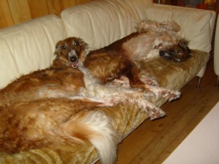 Auguste (mahagonimantel) ist die "aufdinglichere" von beiden. Sie kommt, um ihre Streicheleinheiten einzufordern, setzt sich gerne neben Frauchen und stupst dann mit der Pfote. Agathe (rotmantel) hält sich eher im Hintergrund, sie schmust aber nicht weniger gerne, sie freut sich sehr, wenn man an ihr Kissen kommt und sie knuddelt. Beide laufen ohne Leine, fahren gern im Auto mit, lieben Kinder, alle Hunde und evtl. auch Katzen.