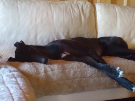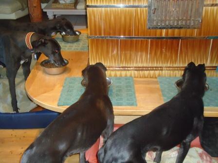 Es hat zwei, drei Tage gedauert, bis sich Buschka in unserem Rudel etwas entspannen konnte. Er fühlte sich wohl bedroht, zur Vorsicht knurrte er, sobald ein Hund an ihm vorbei ging oder sich neben ihn legte. Inzwischen weiß er, dass ihm nichts passiert. Buschka spielt gerne mit den jungen Whippets und rast mit ihnen durch den Garten, dies hat ihm auch schon ein kleines Löchlein im Hinterteil (manche Whippets sind Ratten;-) eingebracht, was ihn aber nur dazu brachte, laut jammernd zur Pflegemama zu rennen.