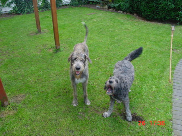 Das ist Karlchen, noch in jungen Jahren, mit seinem Erzieher Rico (Mix aus Bobtail und IW) beim verwüsten von unserem Rasen..