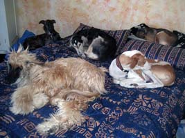 Zu sehen ist hier die Podenco-Hündin Ibi, der Saluki-Rüde Sam, der Afghanen-Rüde Kaschmir und die Chart-Polski-Hündin Syrenka (nicht zu vergessen, die Barsoi-Maus, die schon von Anfang an da war).