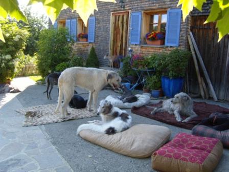 Der "Dicke" ist Leon, darunter liegt der 11 Jahre alte Hamlet, davor Paten-Barsoi-Hündin Kati (der es supergut geht) und rechts auf der braunen Decke das ist unsere mittlerweile 10jährige Paten-IW-Hündin Omi - der es ebenfalls sehr gut geht.