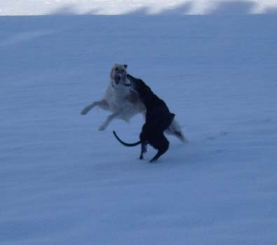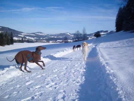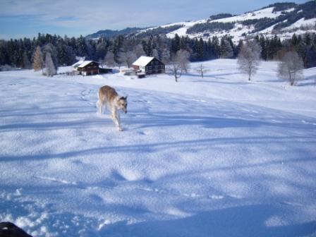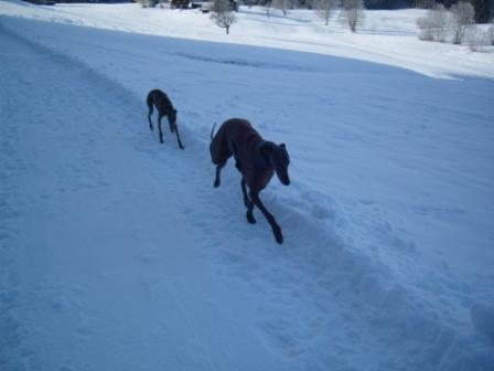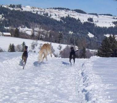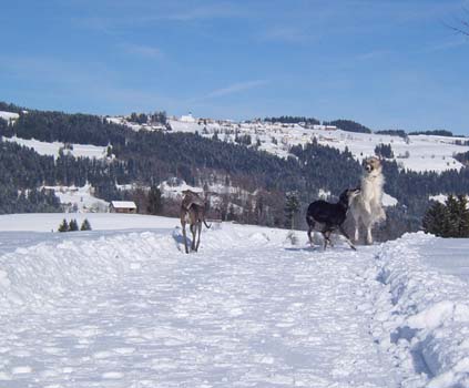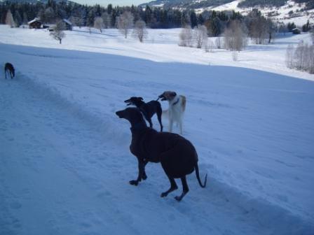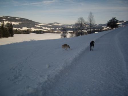 Ein paar Bilder vom Morgenspaziergang mit Cao, Hamlet, Eva und Leo. Cao hat in Hamlet einen ebenbürtigen Renner gefunden, sie rasen nebeneinander her und spielen, ohne Zwicken und Bellen - einfach toll!