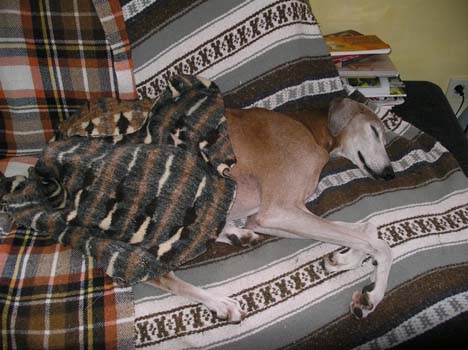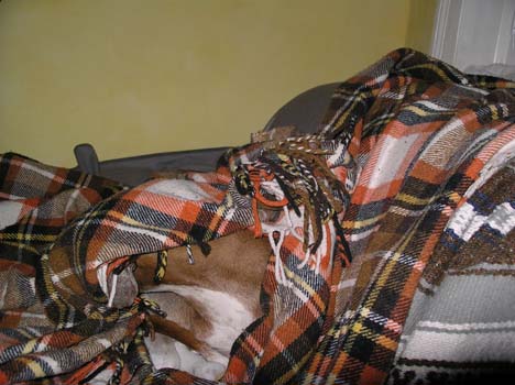 Einen Besuch bei den Eltern mit Gästen und Gänsebraten hat er gut hinter sich gebracht- eifrig bestaunt und mit Leckerlies bestochen, und dann auf der Decke gekuschelt an der Heizung verpennt.