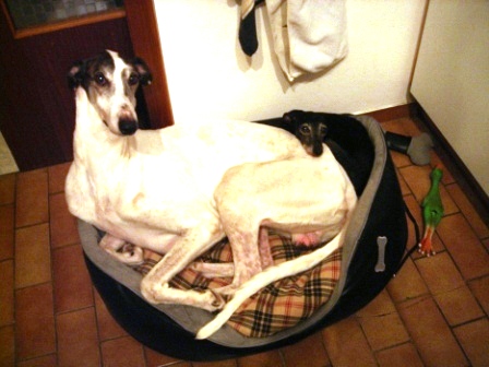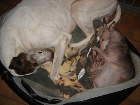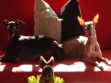 Links Sheba, rechts Samantha-Fledermausi. Man beachte, die Ohrchen von Samantha, dem Kissen und dem Osterhasen sind genau dieselben. Nur die von Samantha sind auch noch durchsichtig;-)