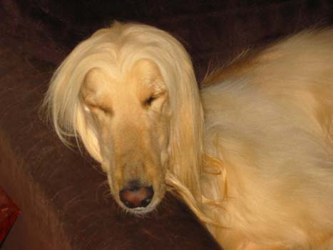 Und nachdem die Süße sich als ziemlicher Drachen entpuppt hatte und wir niemanden fanden, der sie als einziger Hund haben wollte (einem Zweithund konnte man sie wirklich nicht zumuten), entschlossen wir uns, sie als Grand Dame bei uns zu behalten. Da sie mit mehreren Afghanen bei uns lebte, fiel es nicht so sehr auf,daß sie z.T. äußerst übellaunig war. Alle wußten um Dully machte man einen großen Bogen, damit sie nicht zum Drachen wird. Alle unsere Afghanen haben das in kürzester Zeit gelernt und so hatte Dully recht friedliche Tage bei uns. Sie konnte jederzeit in unseren großen Garten zum Sonnen auf die Wiese, sich das beste Sofa aussuchen, Kuscheln etc..Auf dem Spaziergang lief sie immer frei und es war ihr herzlich egal, ob eine Auto in unserer Anwohnerstraße es eilig hatte oder nicht, sie trabte mittig auf der Straße bis sie im Grünen angekommen war. Wir machten dann immer etwas verzweifelt Handzeichen, i.S. "sie ist blind und taub" (war zwar gelogen)- dann war die Empörung und der der Zorn meist schnell verschwunden :).