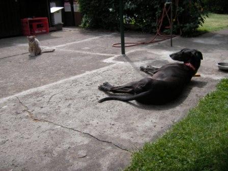 Es ist, als ob sie schon immer dagewesen wäre. Sie verfolgt die Katzen auch im Garten nicht, kommt mit Bubu super aus, schaut sich von ihm vieles ab, wollte z.B. keinen Apfel essen, erst nachdem Bubu ihn gefressen hat, wollte sie auch einen haben. Eine ganz tolle Hündin!"