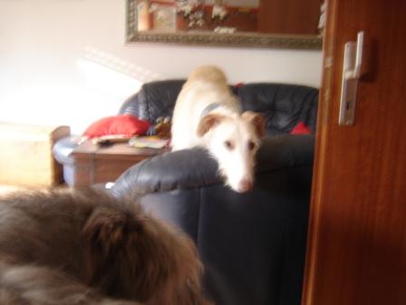Es begab sich zu der Zeit, als Noah von seinen neuen Menschen bei uns abgeholt wurde. Man erspähte das schüchterne Fräulein Pauline und war auf der Stelle völlig begeistert und total verliebt. Natürlich müsse man vernünftig bleiben, schließlich könne man ja nicht zwei neue Hunde mit nach Hause nehmen. Und so brodelte es in allen, man konnte Paulinchen einfach nicht vergessen. Es gab wohl lange Diskussionen, ob ein dritter Hund nötig sei oder nicht, Mann hatte die tolle Idee, wenn Frau das vierte Kind bekommt, dann sei ein dritter Hund auch willkommen;-) Nun, die liebe Sonja mußte nicht schwanger werden, sie durfte Paulinchen auch so abholen. Dieses geschah gestern, einziges Bangen war noch, was Paulinchen mit den Katzen anstellt, aber wir hatten den richtigen Riecher, unser Rauhaarschnuffi kommt mit Katzen prima aus.