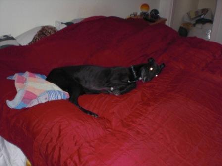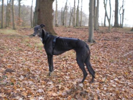 Sie kommt überall mit hin und ist total unkompliziert im Umgang. Wir bringen ihr grade bei, soweit es mit der "Schwerhörigkeit" der Windhunde vereinbar ist, ein wenig zu hören. Sie geht mit uns schön spazieren, hat bei meiner Weihnachtsfeier, die wir in einem zwei Sterne Restaurant verbracht haben, anderen Gästen das Brot aus der Hand geklaut (sie kann ja auch nichts dafür, daß die Tische so derart niedrig sind), Herrchen fährt mit ihr Fahrrad und joggt durch den Wald.