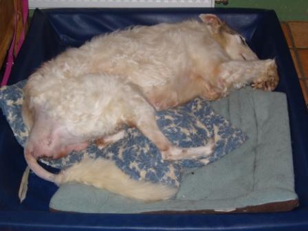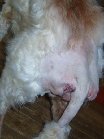 Nun denn, er ist wieder "Zuhause" und erholt sich von den Strapazen. Aus seinem After fließt eine gelbliche, ziemlich streng riechende Brühe und wir müssen doch auch was Humoriges an dem Ganzen finden: Was ist besser, als eine gelblich-stinkende Brühe im Auto verteilt mitsamt einem darin badenden, frisch operierten Barsoi?