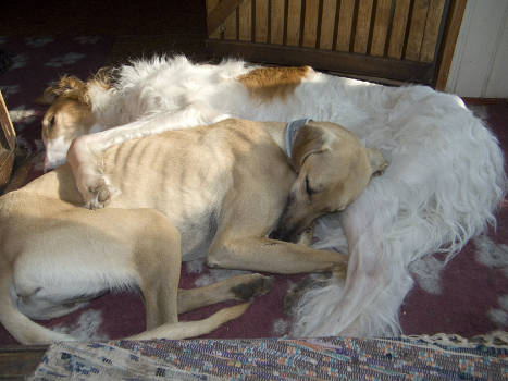 Auf unseren Pflegestellen entwickeln sich hin und wieder die interessantesten Freundschaften: Habib findet jedenfalls, daß die Steigerung einer Daunendecke ein Barsoibauch ist.... (dieser gehört Charly;-)