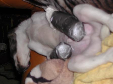 Am 16. Februar kam dieser sechs Wochen alte Stöpsel bei uns an. Seine Vorderbeinchen waren völlig deformiert, der Kleine bewegte sich auf den Außenkanten seiner Pfoten vorwärts. Ein Bild des Jammers.