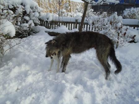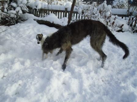 Hier geniesst Matti (ehemals Baby James, jetzt 8 Monate alt) mit seinem Deerhoundfreund den ersten Schnee seines Lebens;-)