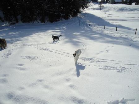 Wenn alles klappt und der Rudelchef unseren Tamino nicht gleich frißt;-) sind die Wüsten-Tage für unseren alten Galgo gezählt. Ebenfalls Sonntag treffen die beiden Rüden aufeinander. Hier rennt Tamino heute Morgen noch ahnungslos durch den Schnee.