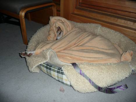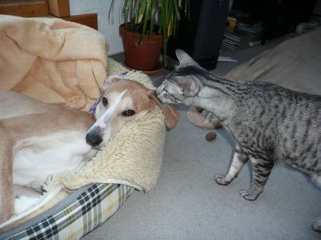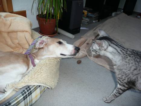 Einmal hat sie anfangs den Kater gejagt, aber nach einem Donnerwetter und viel Üben hat sie jetzt eine beachtliche Reflexkontrolle, auch bei wüsten Verfolgungsjagden an ihrem Korb vorbei oder an ihr vorbei, wenn sie im Flur steht. Die Katzen finden sie nach wie vor interessant, besuchen und beschnuppern sie in ihrem Korb oder wenn sie sich unterwegs in der Wohnung treffen, und Johari schnuppert zurück.