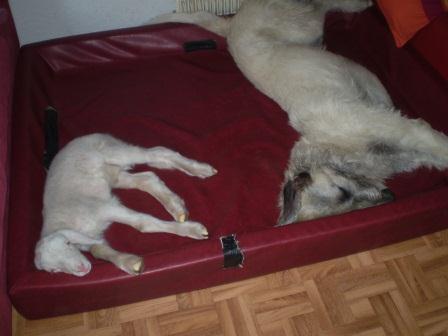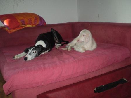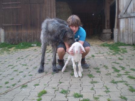 Nun wächst das Lämmlein mit Wölfen, Whippet und Galgo auf, wird alle vier Stunden fachgerecht gefüttert und ist natürlich inzwischen überwiegend draußen, es muß ja ans "normale Schaf-Leben" gewöhnt werden;-)))