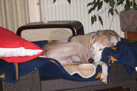 Auch wenn dort immer viel los ist, bot es uns den passenden Rahmen mit viel Zeit, daß Azawakh-Hündin Gisada und ihr Frauchen sich in aller Ruhe den Buben angucken konnten...und es paßte! Wie man auf dem Foto sieht, ist der Bub von seinem Tag völlig erschöpft und liegt aber doch auch schon recht entspannt im neuen Zuhause. Auch hier ein Dank an unsere derzeitige Spitzenfahrerin und natürlich auch an Farinos Pflegemama, die den Buben nur schwer noch ziehen lassen konnte.