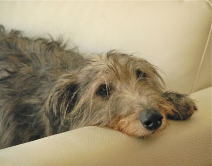 Roy räumte seinen Sofaplatz und mußte seine Nase auf dem Boden parken, weil das Ausweichkissen zu klein war.
