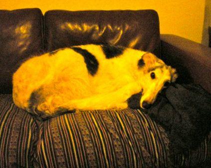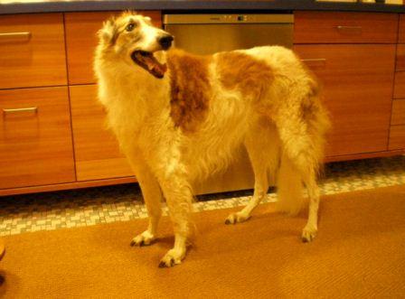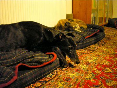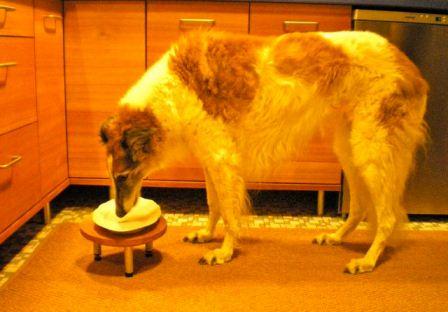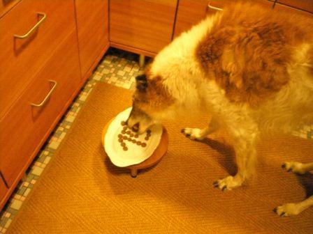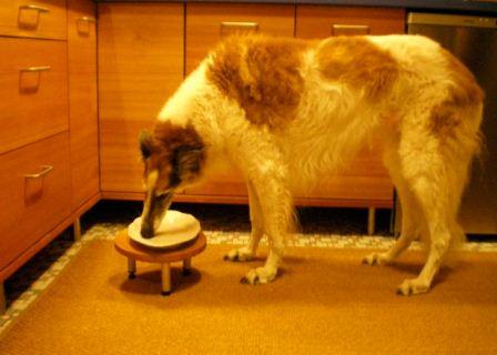 Galga Sophie wartet auf den Startschuss zum Festessen.