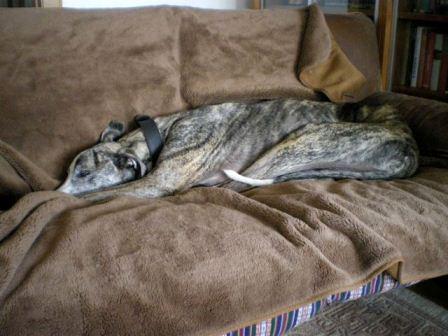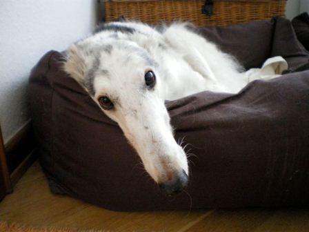 "Hast Du gut ausgesucht den Paco, auch wenn Nicolai (noch) sehr beleidigt ist, “den haben wir doch gar nicht gebraucht”. Paco ist ein ganz lieber, freundlicher Schatz, der möglichst alles richtig machen möchte und vermittelt, dass er sich freut. Heidi hat ihm natürlich gleich klar gemacht, wer hier die Seniorchefin ist und Sofie hält ihn mit Gezicke auf Abstand, die Greys sind dagegen interessiert und wedeln ihn freundlich an, nur als er ins Bett wollte, wo Dama schon war, hat Dama ein bisschen geknurrt. Das gemeinsame Futtern in der Küche ist problemlos. Ein Sofa hat er sich schon ausgesucht, da schläft er im Moment auch nachts, die Dreambays hat er noch nicht ausprobiert, ich glaube, er findet sie zu klein. Der Garten gefällt ihm, er nutzt die längstmögliche Strecke für wilde Sprints. Edith (Anmerk. das ist die Schwiegermama) ist ihm noch nicht ganz geheuer, die Leckerlis sind ja in Ordnung aber der Stock..."