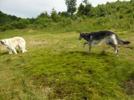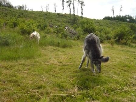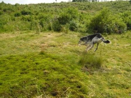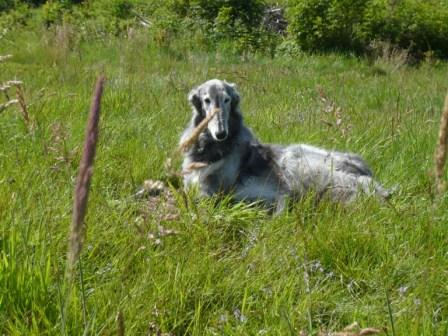 "Auf den Spaziergängen gibt es (für ihn) viel mehr zu gucken und zu riechen, fast jedesmal treffen wir Rehe, Füchse, Eulen, Hasen - da wird der alte Herr richtig munter! An jeder Waldecke gibt es ein Bächlein zum Füsse kühlen oder für das Schlückchen zwischendurch...herrlich!