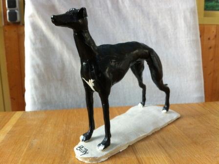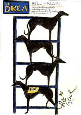 Wenn Windhund Menschen zusammen sitzen kommen manchmal die komischsten Sachen raus. Bärbel unsere Künstlerin erzählt was von Modelliermasse und ich gleich voller Begeisterung. „Eine Freundin von mir hat sich auch an Modelliermasse versucht und hat eine ganz tolle Figur von meinem Hund Billy gemacht.“ (siehe Bild 1) ich also voller Stolz. „Ich hab nicht nur eine Windhundfigur. Ich hab eine Billyfigur!!!“ Darauf kommt von Bernhard ganz trocken. „Gib nicht so an. Ich hab Zuhaus ein ganzes Billy Regal.“ Das hat Bärbel dann auf ihre Art für uns fest gehalten. (siehe Bild 2)