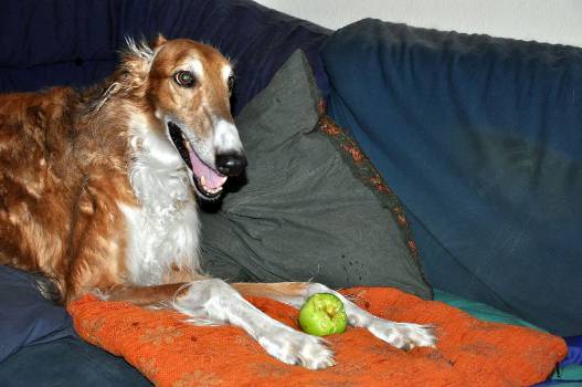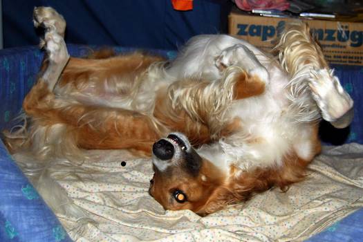 Ich habe einen so großen "Gute-Laune-Barsoi" zu jeder Tages- und Nachtzeit mit so einem breiten Grinsen und so einem ausdauerndem Schwanzwedeln, so einem fröhlichen "Kopf in den Bauch von Frauchen drücken und kraulen lassen" so noch nicht erlebt. Er hat sich allerdings das Zeigen seiner Freude am Leben erst erarbeiten müssen. Und endgültig eingekehrt ist sie, als wir vor ca. 1 1/2 Jahren kurz entschlossen noch einen damals 7 Mon. alten Barsoi-Chortaj-Mix aufnahmen, von dem er sich ein Stück an Unbekümmertheit und Selbstvertrauen abgeguckt hat.