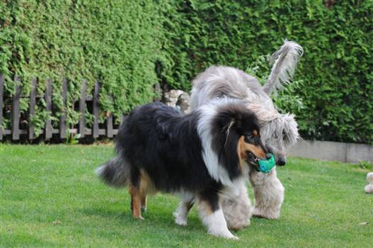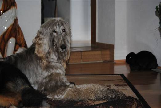 Timmys Besitzerin ist es tatsächlich gelungen, den Buben an ihr Kaninchen zu gewöhnen, das vor Timmy nämlich bereits sozusagen wie ein Mini-Hund mit anderem Afghanen und Collie im Haus gelebt hat.