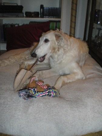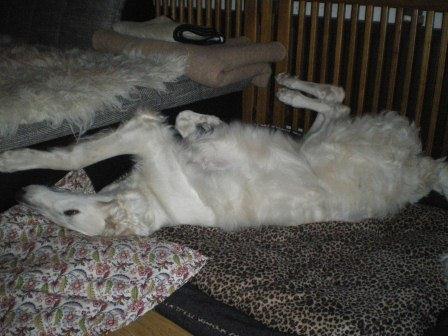 Gut, dass ich eine ebenerdige, riesige Dusche habe. Heute hat sie mit mehreren Hunden gespielt und sich zum Schluss im Matsch gewälzt. Der ehemals weiße Hund war braun und grün. Das Duschen mit lauwarmen Wasser findet sie toll! Nach der Dusche wurde ein Zahnreinigungsknochen bearbeitet und nun schläft das liebe Schäfchen tief und fest, sodass ich mich an den PC setzen kann.