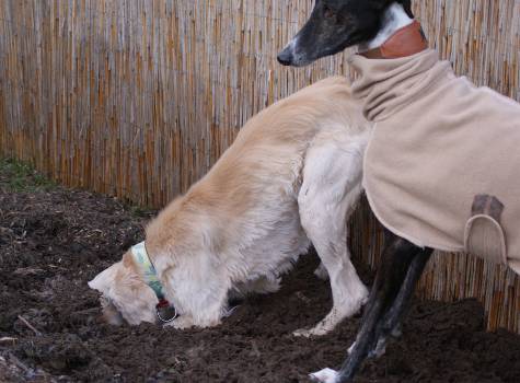 "Nesrin macht sich gut, sehr gut sogar. Wird jeden Tag frecher und fröhlicher, gräbt mit großer Freude Krater in die Landschaft und ist für jeden Blödsinn zu haben. Aber wo die Liebe eben hinfällt ... zur Zeit tobt Nukhet weiter wie eine Wilde mit der vertrauten Freundin Myszka (die cremeweiße Barsoihündin )und Nesrin ebenso wild mit Vasja dem Barsoirüden. Das überrascht mich sehr, denn Vasja zeigt nur höchst selten Interesse am Spiel mit anderen Hunden. Außer seiner Myszka sind ihm alle anderen Hunde herzlich egal. Sogar die schöne Lizek (die rote Barsoihündin ) ist seit fast einem Jahr Luft für ihn ... aber Nukhet und Nesrin, die mag er beide gut leiden!"