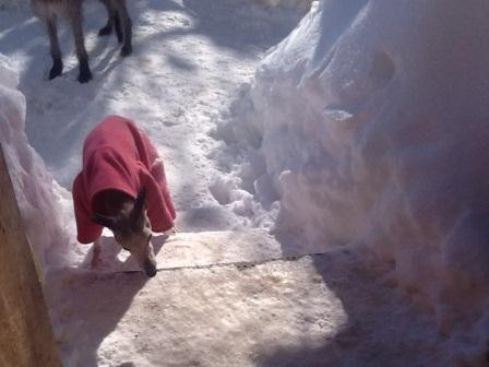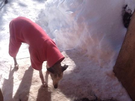 Es ist kalt und wir haben zwei "Snuggles" bestellt, supertolle Fleeceanzüge mit Beinchen. Auch wenn Lilli mal "neben der Spur" läuft, also etwas im Tiefschnee landet, ist das kein Drama, Fleece ist ruckzuck wieder trocken.