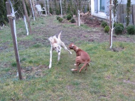 Wohngemeinschaft. Tenner mochte ihn ebenfalls auf Anhieb, was die Bilder von heute morgen auch wieder zeigen. Die beiden teilen sich Garten, Sofas und unser Bett sehr einträchtig. Zu Arielle ist Monty sanft und distanziert.