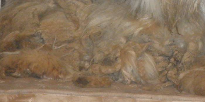 Petra hat spätestens jetzt die Meisterprüfung als Hundefriseur bestanden. Denn Filz, der ganz dicht an der Haut sitzt ohne Verletzungen zu entfernen ist eine Königsdisziplin beim Scheren. Zudem das Fell teilweise bereits eine betonähnliche Konsistenz erreicht hatte, daß wir uns zeitweise überlegt haben, ob wir nicht ein Teppichschneidemesser zur Hilfe nehmen müssen.