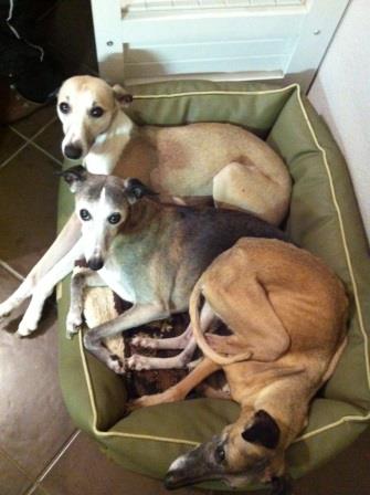 Anbei mit ganz lieben Grüßen und Fotos mit Pepsi, ihrer "Lebensgefährtin" und Lala, der Whippetine meiner Mutter bei uns im Urlaub. Es ist nicht so, dass wir nicht genügend Kuschelkörbchen hätten - aber das "Haufenprinzip" finden sie besser...