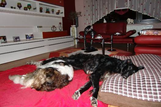"Unser „black Devil“ ist ein großer Engel. Nachdem er während der ganzen Heimfahrt und bis 03.00 h in der Nacht geweint hat, hatte er letzte Nacht geschlafen wie ein Murmeltier. Wir hatten gestern Damenbesuch – zwei ganz hübsche Barsoimädchen kamen mit unseren Freunden vorbei. Während Gregor noch ziemlich ängstlich war, hat Galyano (ehemals Krimsky) mit der jungen Bajara heftig geflirtet und getobt und später – wie man auf einem der Bilder sieht, gemeinsam ein Nickerchen gemacht. Galyano hat sich ganz schnell bei uns eingelebt und verfolgt mit Gregor das Frauchen auf Schritt und Tritt. Oh – jetzt straft er mich Lügen. Gerade in diesem Moment macht er seinen ersten Alleingang im Garten . Alles in allem können wir nur sagen, dass er ein großer Schatz ist, immer nur liebenswert . Er hat uns direkt um den Finger gewickelt. Wir geben ihn nie wieder her.