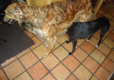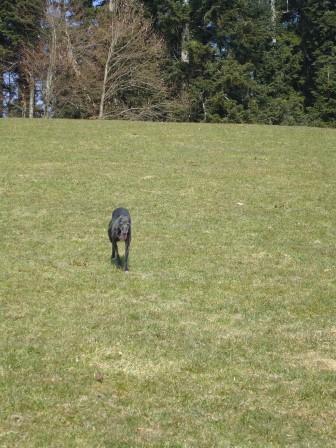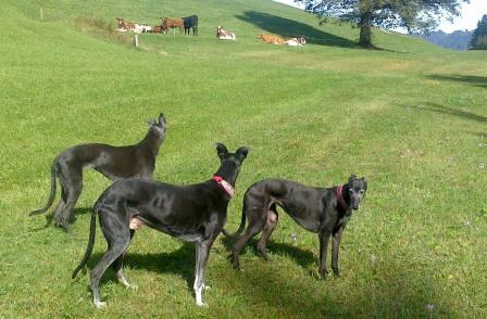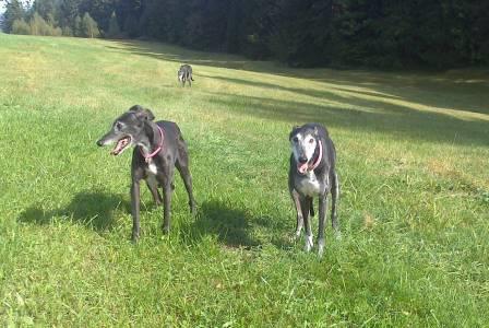 Wir übernahmen dann fünf Greyhounds von dort, das waren die letzten, die noch kein Zuhause gefunden hatten. Millie, von der wir auch kürzlich tolle Geburtstagsfotos bekamen (müssen wir noch zeigen...) und unsere Ali sind jetzt dreizehn Jahre alt. Um die Augen schön weiß geworden, geht es Ali noch ganz hervorragend. Sie ist eine sehr bezaubernde, kleine Maus, sehr introvertiert aber sehr sensibel und treu. Wenn sie bei den täglichen Gartenkackieinsammeltouren fehlt, dann stimmt was nicht. Selbst bei Regen geht sie mit raus, läuft uns Schritt für Schritt nach. Rennen ist nicht mehr so ihr Ding, sie liebt es, gemütlich spazieren zu gehen, unterwegs wird an jeder Menge Blümchen geschnuffelt und oft nimmt sie einen Happen frisches Gras zu sich. Besucher findet sie nicht so spannend, sie zieht sich lieber zurück.