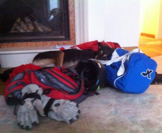 Sie hangt sehr an meiner jüngeren Tochter. Das ist ihr allerliebstes Frauchen. Sie stiehlt verschiedene Sachen die meiner Tochter gehören und schläft mit ihnen auf ihrem Kissen. Auf dem Foto Fasona im Gepäck, das war als meine Tochter vom Snowboarden zurückgekehrt ist. Wohlgemerkt, die Handschuhe vorne, die meiner Tochter gehören waren in der Tasche von dem Freund. Sie hat sie sich herausgesucht und zu sich gelegt!