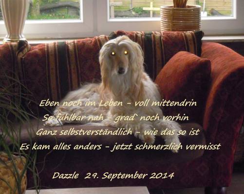 Liebe Sabine, vielen lieben Dank, daß Dazzle seine letzten Tage liebevoll von Euch umsorgt wurde.