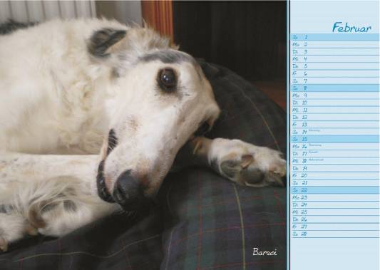 Unser Kalenderbild für den Monat Februar. Nicolai war einer von 22 Barsois, die einst unsere Hilfe brauchten. Er verstarb leider im Juni letzten Jahres, nachdem er seit 2009 bei Eva und Heinz-Georg eine schöne Zeit hatte!