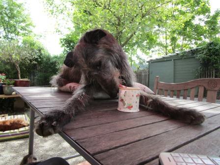 Nur, weil Feiertag ist - hier ein Deerhound, der auf dem Gartentisch unseren Milchkaffee schlürft. Ok, eigentlich ist er zum Spüldienst eingeteilt...