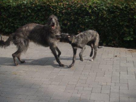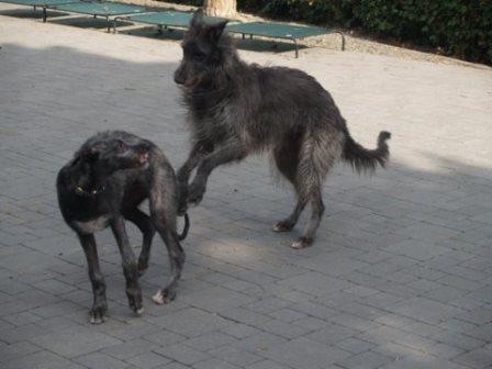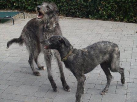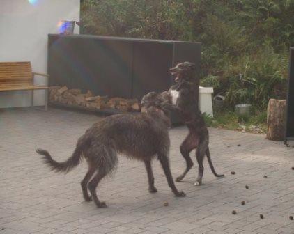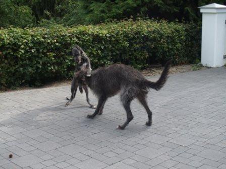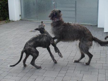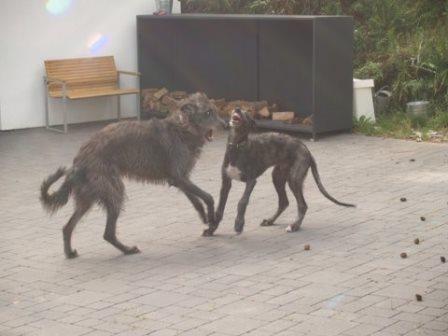 Passend dazu hat uns Alexandra aktuelle Fotos von Ferdi (verm. 03/2014) geschickt. Ferdi hat einen Kumpel bekommen, nun sinds drei Deerhounds... jaja... Alexandra rief einst bei uns an um sich nach einem Deerhound zu erkundigen, einfach so, damals war keiner in der Vermittlung. Sie hatte einige Galgos, wir meinten, dass die Galgos mit der Wildheit eines Schotten nichts anzufangen wüssten.... Alexandra rief das nächste Mal an, als wir Ferdi in der Vermittlung hatten. Sie hatte sich inzwischen einen Schotten gekauft und festgestellt, die meisten ihrer Galgos treten spontan die Flucht an, wenn der loslegt :-) Nun passte Ferdi wie die Faust aufs Auge und jetzt kam nochmal ein Welpe dazu.
