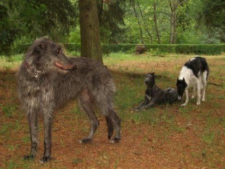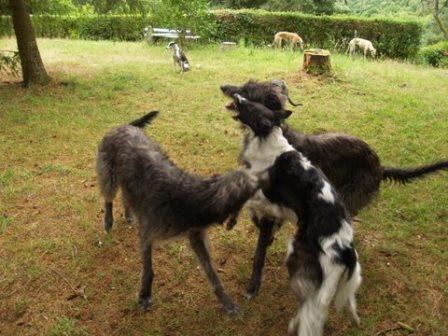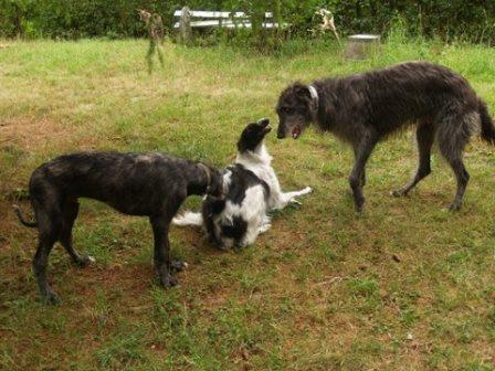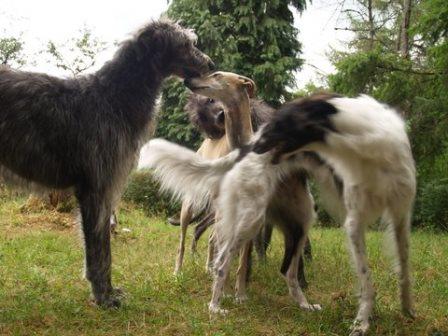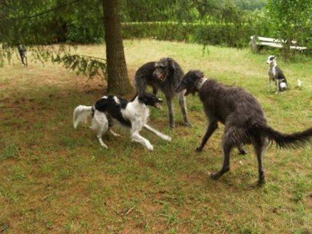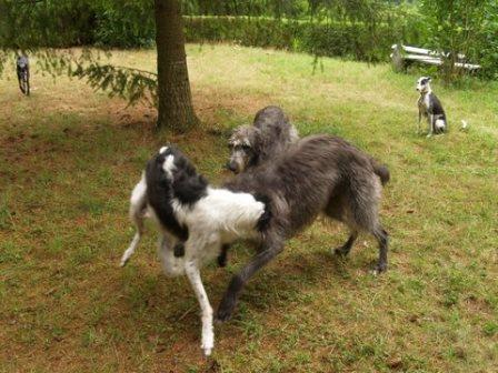Und zwischen Ferdi und seinem neuen Kumpel kam noch das Barsoimädchen Ivy im September 2014 zu Alexandra. Sie war bei Abholung von Ferdi vollauf begeistert von der hübschen Maus, die zwar ein krummes Bein hat, aber trotzdem flitzen kann und sich sooo toll mit Ferdi verstand. Es rumorte dann noch ein wenig im Herz und im Verstand... und seitens der besseren Hälfte... bis dann Ivy zu Ferdi ziehen konnte.