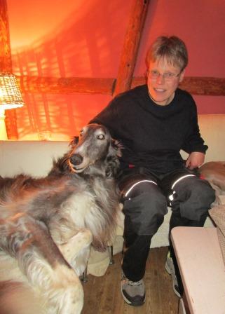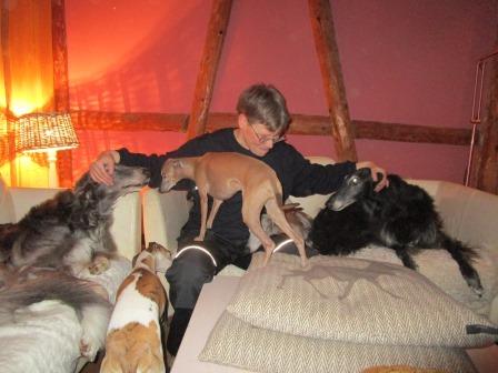 Andrea hat ja bereits einige Barsois von uns gehabt und beherbergt noch das Flöckchen. Irgendwann vor geraumer Zeit hat sie noch zwei Jungbarsoile bei sich aufgenommen, so sind es jetzt mit Socke und Mütze fünf an der Zahl.