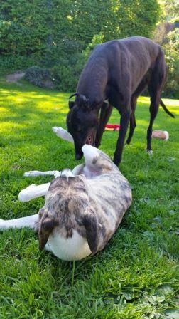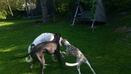 Schaut euch doch mal diese herrlichen Bilder an. Diese Meute hat einen Riesenspaß. Das gilt nicht nur für die Jungspunde Honey-Amy, Matteo und Carino, auch für Jonas und den alten Spicy ist ein Garten ein Riesenstück Freiheit und Genuß. Und dass wir uns genau SO ein Leben für alle unsere Hunde wünschen, ist doch nichts Ärgerliches. Schließlich vermitteln wir ja auch an Menschen, die keinen Garten besitzen:-)
