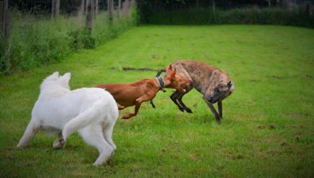 Der Leiter hatte uns damals auf den AB gesprochen und um Vermittlungshilfe gebeten, wir wollten das noch persönlich mit ihm besprechen... da hatte er es bereits auf der TH-Seite vorgestellt und es begann ein regelrechter Run auf das kleine Barsoile. Das TH-Telefon klingelte ununterbrochen, auf Facebook waren häßliche Kommentare zu lesen, von wegen das sei unmöglich, ein Barsoile zu einem Dobermann in den Zwinger zu stecken - dabei haben die beiden hervorragend gespielt, der Dobi war jung. Wir haben dann getröstet und von unserem Miro berichtet, den wir zu einem Kangal vermittelten und auch Schelte bekamen - obwohl die beiden ein tolles Team sind. Aber kurz und gut: Das Mädchen befindet sich bei einem iWi-Mitglied im Schwäbischen und es geht ihr allerbestens. Neulich hat unsere Gaby die kleine Truppe unterwegs beim Spaziergang getroffen und war begeistert.