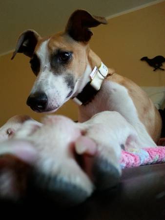 Zauberhaft ist sie, eine fröhliche, intelligente Hündin mit dem Schalk im Nacken, ein Garant für gute Laune, sie sprudelt vor Energie, Lebensfreude und Mut und entdeckt mit großen Augen die Welt. Sie ist wunderbar mit anderen Hunden, sie findet Kinder super, sie lernt wie der Blitz und läuft seit der 2. Woche bei mir frei auf den Spaziergängen. Hanni hat sich zwischenzeitlich mit ihr arrangiert (und findet sie „noch heimlich“ echt gut) nach ausführlichem Gemotze am Anfang. Und das olle Whippchen liebt mit ihr zu kuscheln.