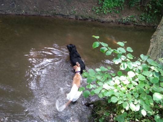 Der Zufall wollte es, dass ich just beim Hund abholen in der Hälfte meines Urlaubs war und uns somit ein paar Tage zum „miteinander eintanzen“ blieben. Nicht nur für mich und Malu sondern eben auch für die drei hier bereits lebenden Vierbeiner. Der schwarze Eumel (so nennst Du sie ja) Jette hat sich quasi umgehend mit um Malu gekümmert... nicht erwachsen - da ist klar das Jette parat steht. Und so ist es auch jetzt: Jette zeigt die Welt, natürlich nicht nur die für mich praktische Dinge sondern eben alles: wie schwimmen geht, das Menschenka.... und Pferdemist super delikat ist, das Kirschen gut schmecken und und und.... aber eben auch das es sich lohnt zu kommen wenn gerufen wird, das andere Menschen & Hunde super sind und das Altenheim-Besuche Spaß machen. Also hier geht’s flott voran wie du liest. Es ist richtig Leben in der Bude! Und es gibt einen Überraschungsfaktor wenn sie alleine zuhause waren – Malu ist nämlich vielseitig interessiert: sie schaut was in Regalen so steht, guckt Bilder an, liest recht unkonventionell Bücher, will wissen wie Reißverschlüsse an Kissen funktionieren UND sie hat eine Affinität zur Technik! Ihre Leidenschaft sind Kabel... wir lassen das mal so stehen.