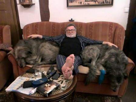 eben im Facebook entdeckt, ein Foto vom November 2015 mit dem Kommentar: "Langweiliger Film. Alle eingeschlafen." Günter mit seinen Wölfen, der rechts ist unser Norman (vermittelt Juni 2012).