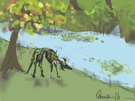 Gestern waren wir an der Ems. Das ist tollll, weil da können wir flitzen und Greystoke geht so gerne ins wasssser. Ich nich. Weil wegen meine Locken, du weißt ja.